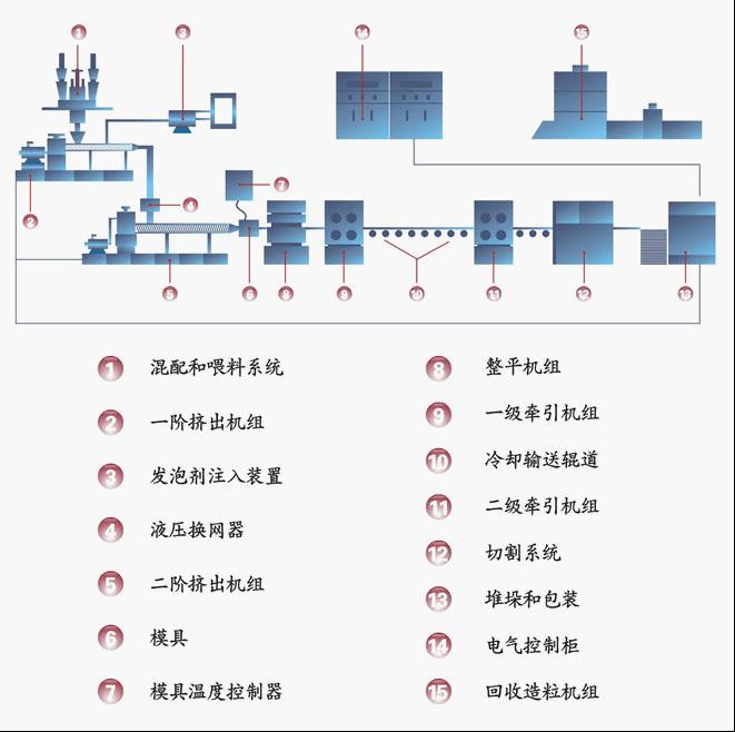 XPS發(fā)泡板材生產(chǎn)線使用的主要原料是全新或回收的聚苯乙烯(PS)顆粒,通常需要加入色母?;蜃枞紕┑忍砑觿?,把混配后的原料喂到一階擠出機組進行熔融塑化并攪拌,持續(xù)注入發(fā)泡劑(如氟里昂、丁烷和二氧化碳CO2等)并快速混煉加壓,然后擠出通過液壓換網(wǎng)器,把流體聚合物中的雜質過濾出來,接著混合物被推送到二階擠出機組,進一步地充分混合并降溫,在此階段對聚合物的溫度和壓力進行控制,而后被擠出有特定流道的模具,此時混在聚合物中保持高壓的發(fā)泡劑在瞬間壓力釋放,發(fā)泡劑氣化形成很多各自獨立的微小氣泡,被包裹在聚苯乙烯膜泡內(nèi),經(jīng)冷卻定型形成截面均勻、閉孔蜂窩狀的板材,接著是整平機組和牽引輸送輥道,然后經(jīng)過切割系統(tǒng)得到預定尺寸的XPS擠塑板,后是堆垛和包裝入庫。邊角廢料通過回收造粒機得到循環(huán)利用。一般情況下,XPS板材還要經(jīng)過開槽、表面打毛或銑邊成型等處理以滿足不同的應用。